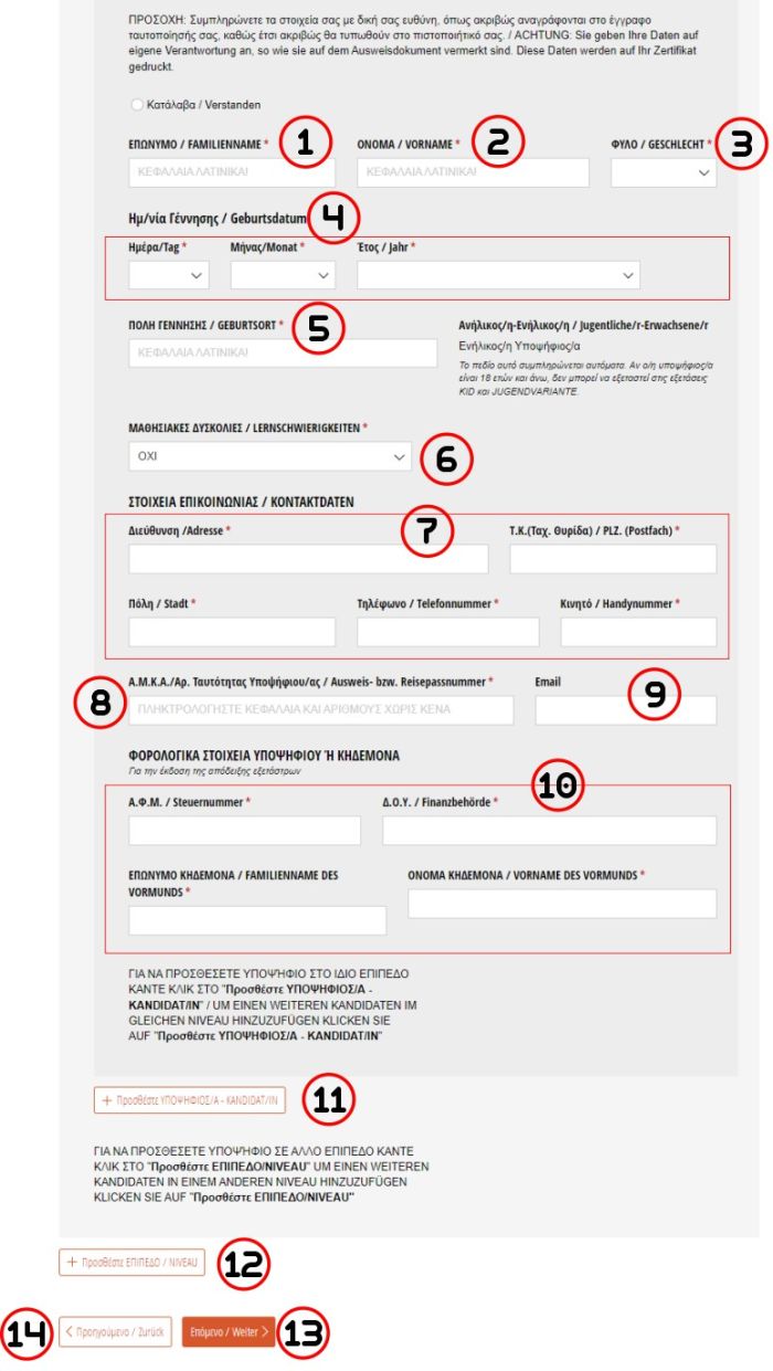 Προσοχή: Βεβαιωθείτε πως έχετε καταχωρήσει σωστά τα στοιχεία των υποψηφίων πριν ολοκληρώσετε την εγγραφή.