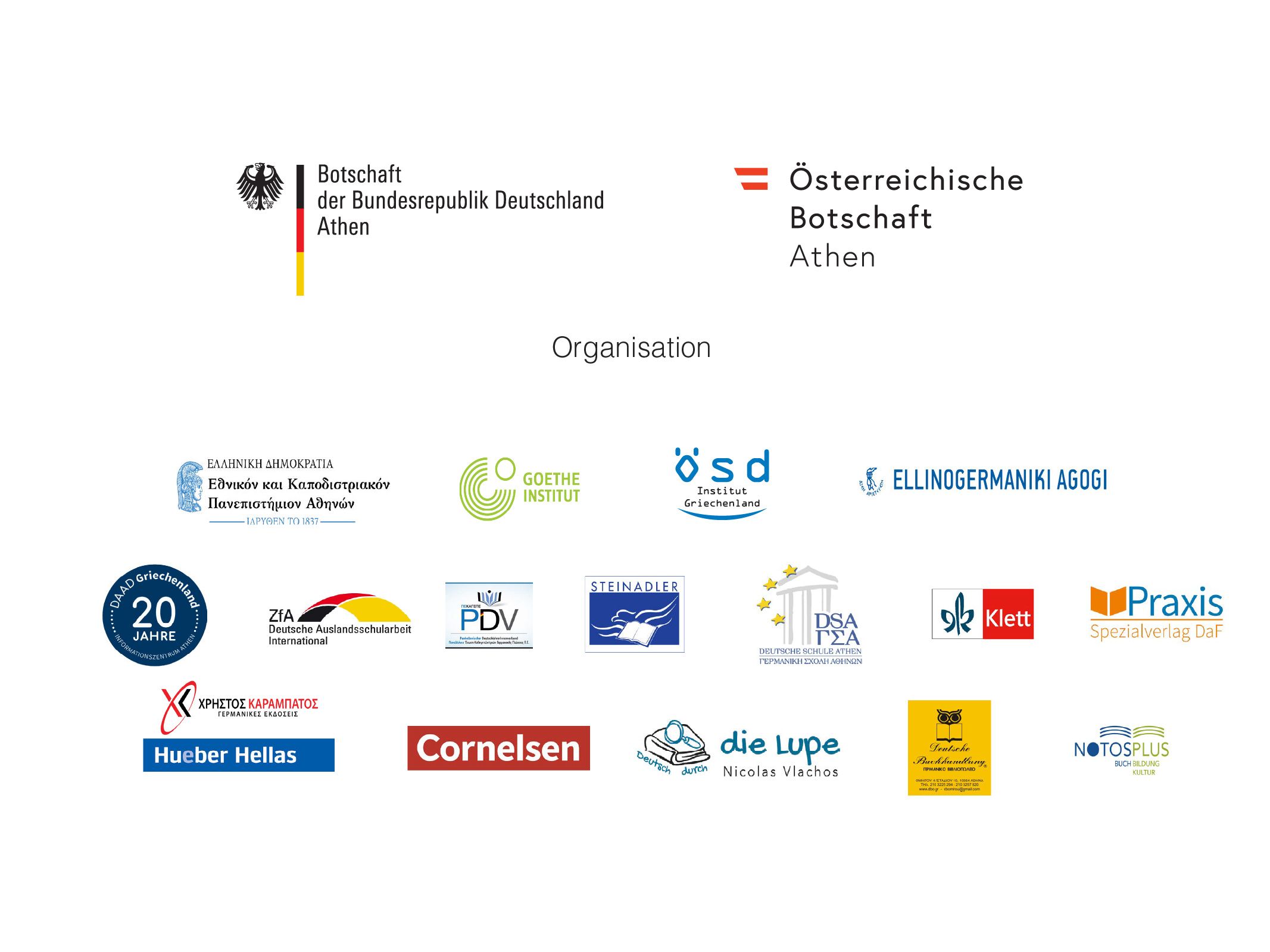 Diese Konferenz vereint die wichtigsten DaF-Akteure unter einem Dach. Zu den Organisationspartnern gehören das Goethe-Institut Athen, das ÖSD Institut Griechenland, die Ellinogermaniki Agogi, der Fachbereich für Deutsche Sprache und Literatur der Universität Athen, der Panhellenische Deutschlehrer*innenverband, und die Verlage für Deutsch als Fremdsprache, der Deutsche Akademische Austauschdienst, die Zentralstelle für das Auslandsschulwesen, die Deutsche Schule Athen und die Schulberater für Deutsch, die als wichtige Träger der deutschen Sprache in Griechenland fungieren.