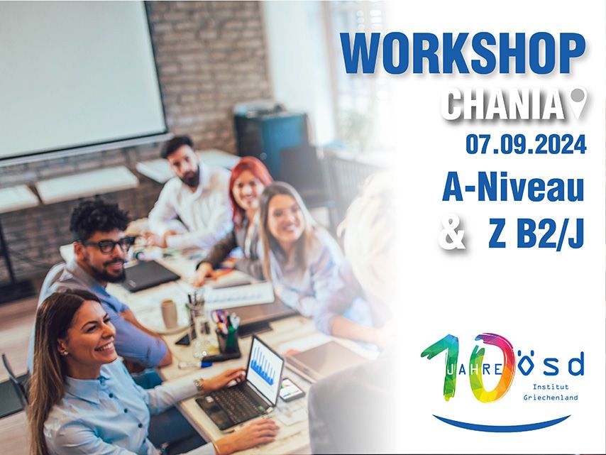 Αρχές Σεπτεμβρίου πραγματοποιήθηκε στα Χανιά Workshop με κεντρικό θέμα τα επίπεδα Α2 και Β2. Οι συνάδελφοι από την Κρήτη παρακολούθησαν την παρουσίαση της εξετάστριας του ÖSD κ. Ξανθάκος και του συνεργάτη κ. Ευαγγελίδη με μεγάλο ενδιαφέρον και έλυσαν κάθε απορία τους. Ευχαριστούμε τους καθηγητές και τις καθηγήτριες Γερμανικών από την Κρήτη για την παρουσία τους!